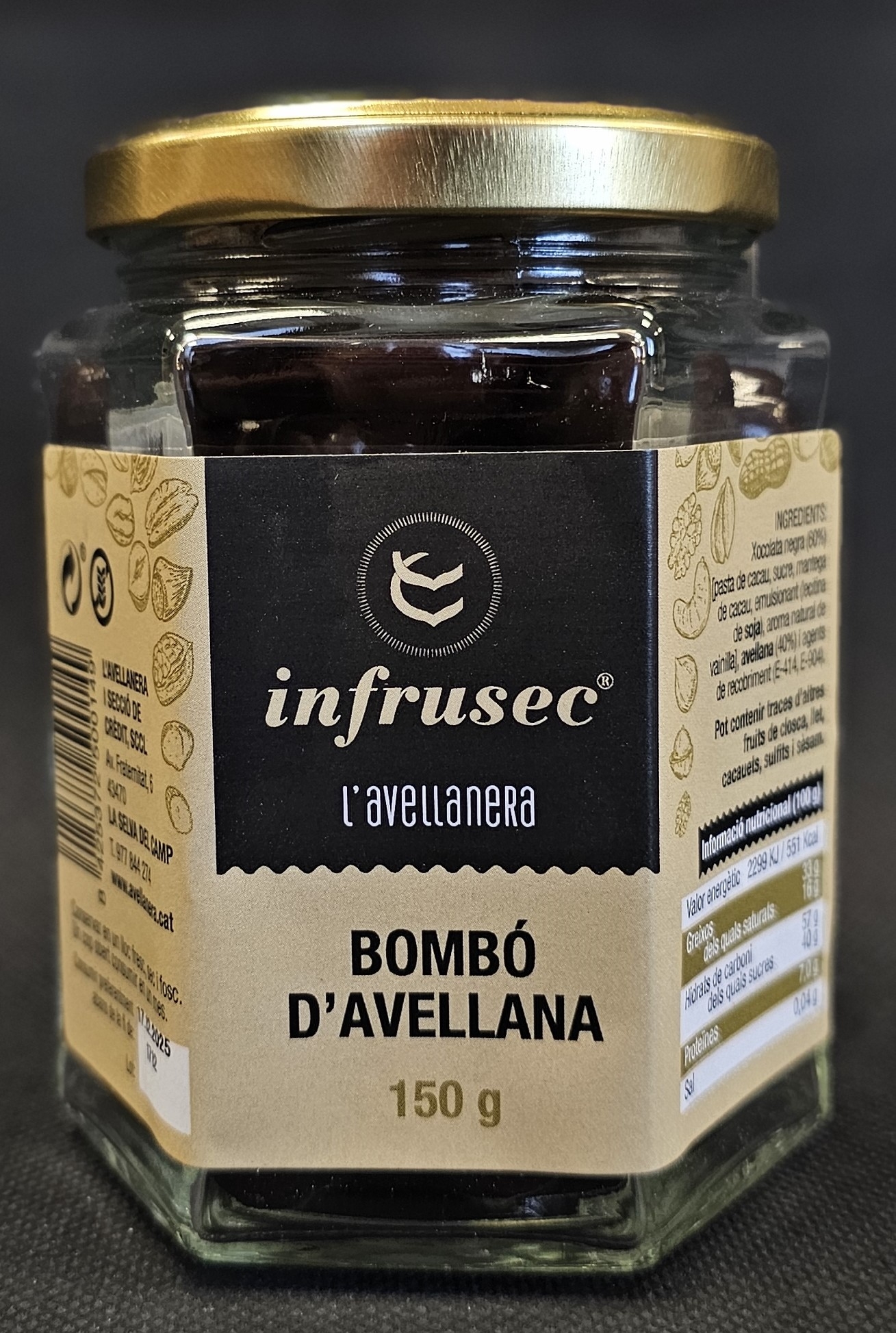 Bombó avellana Infrusec Avellanera coberta en xocolata negra, una delícia plena de sabor.