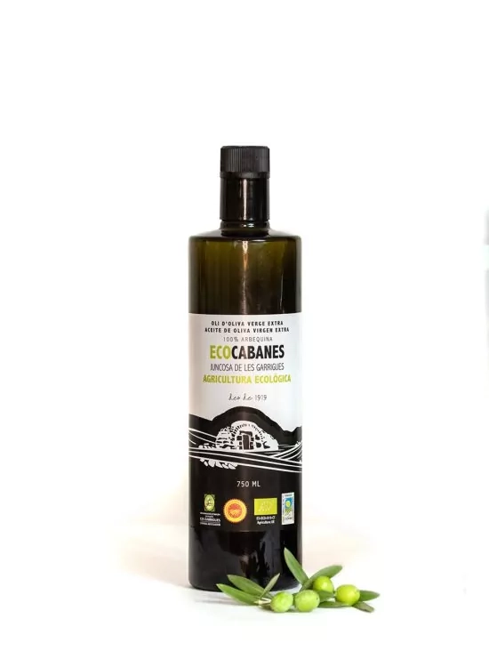 EcoCabanes és un oli d’oliva verge extra ecològic elaborat exclusivament amb olives arbequines procedents de cultiu certificat ecològic.
