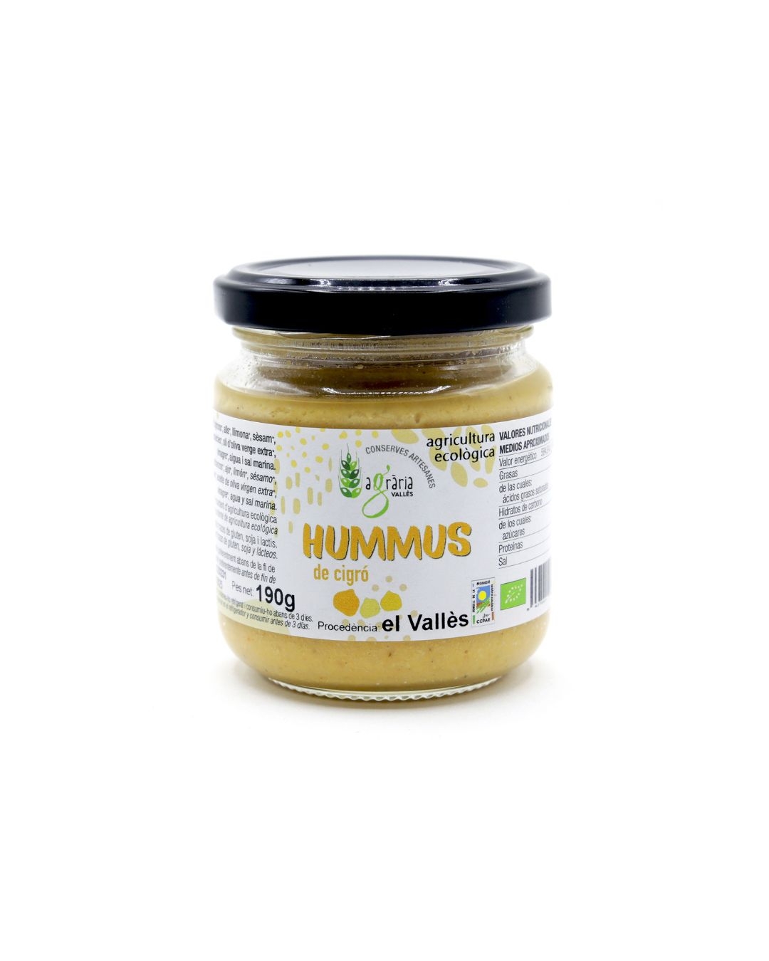 Ingredients: Cigrons, all, llimona, sèsam, espècies, oli d’oliva verge extra, vinagre, aigua i sal marina.