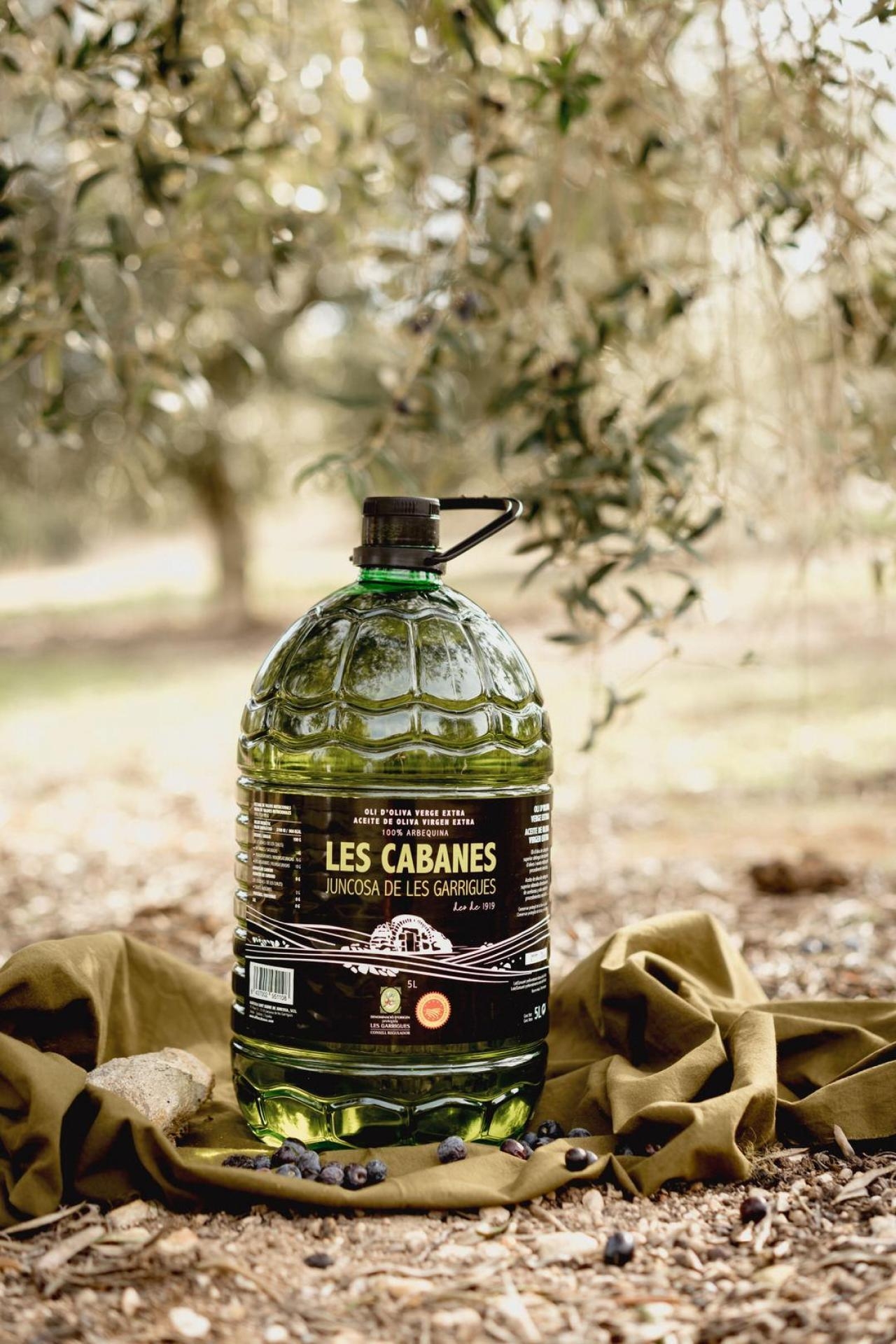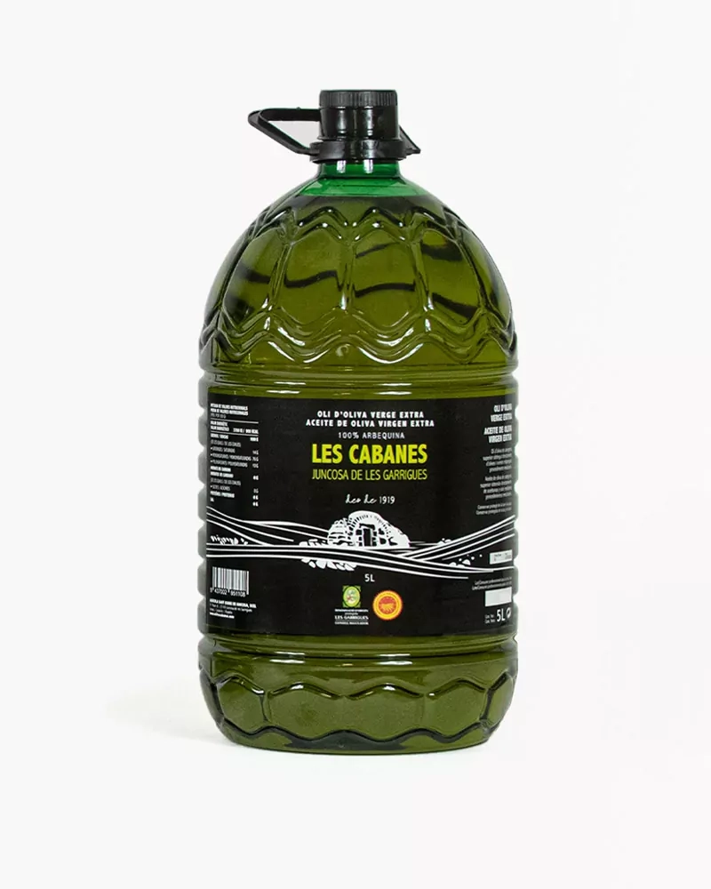 L’oli d’oliva verge extra Les Cabanes s’elabora amb olives arbequines 100 %, collides en el moment òptim de maduració i premsades en fred al molí propi de la Cooperativa de Juncosa de les Garrigues (Lleida).