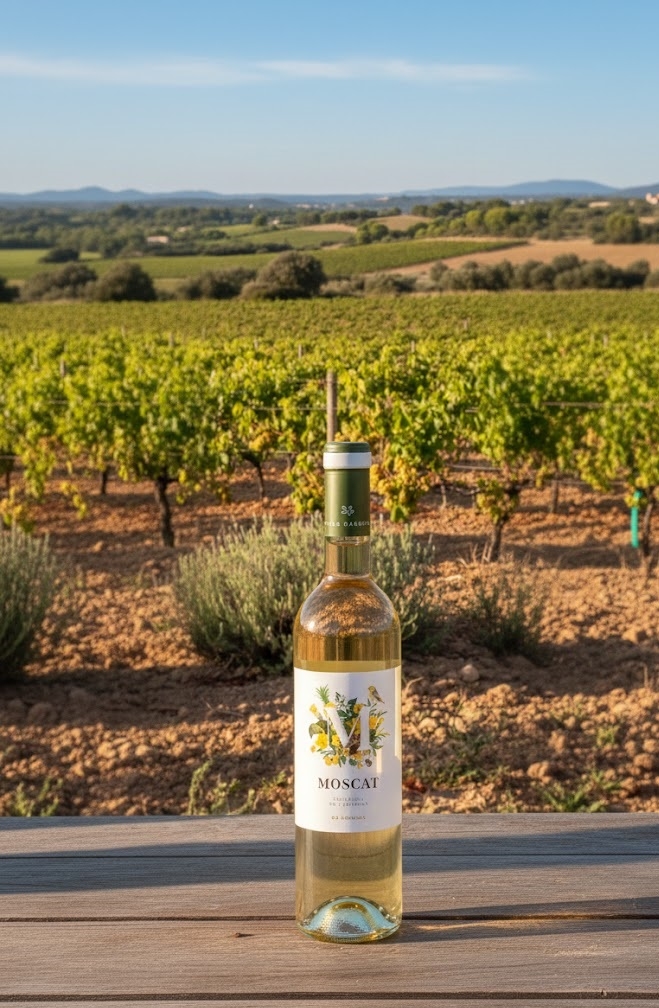 Moscatell de l'Empordà, produït per la Cooperativa de Garriguella, Girona. S'ha elaborat amb raïm recol·lectat manualment en el seu punt òptim de maduració, procedents de vinyes seleccionades per la seva qualitat. El most flor s’obté després d’una maceració a baixa temperatura durant unes hores per extreure al màxim els aromes naturals de la fruita. Durant l’inici de la fermentació s’afegeix una petita quantitat d’alcohol, cosa que permet conservar els sucres naturals i els aromes primaris de la fruita.