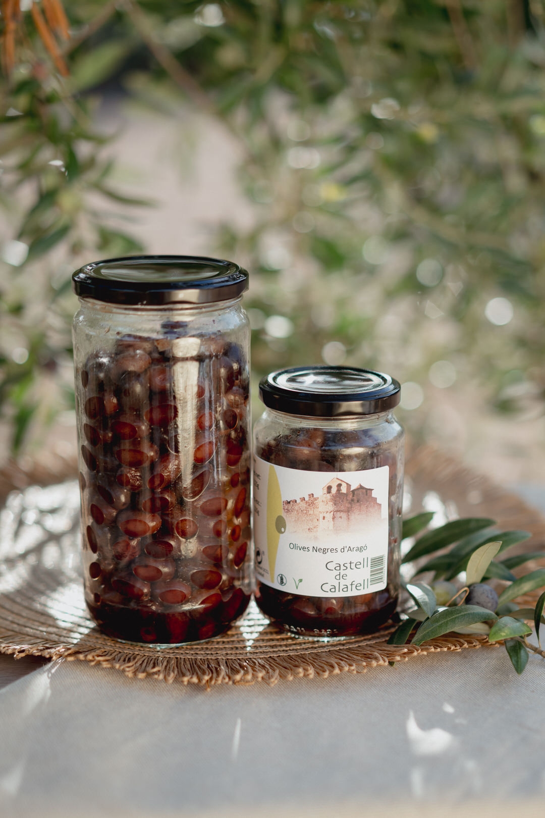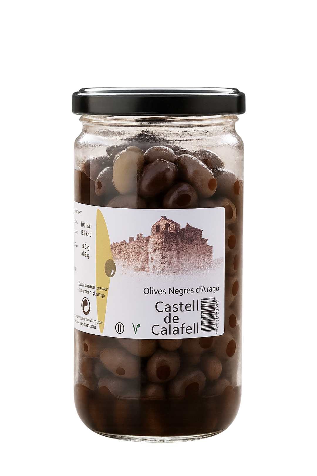 Les Olives Negres d’Aragó Castell de Calafell són elaborades per La Masrojana, empresa amb arrels cooperatives situada a Móra d’Ebre (Ribera d’Ebre, Tarragona). S’elaboren a partir de la varietat Empeltre, típica del Baix Aragó, una de les varietats més emblemàtiques d’oliva negra del territori.