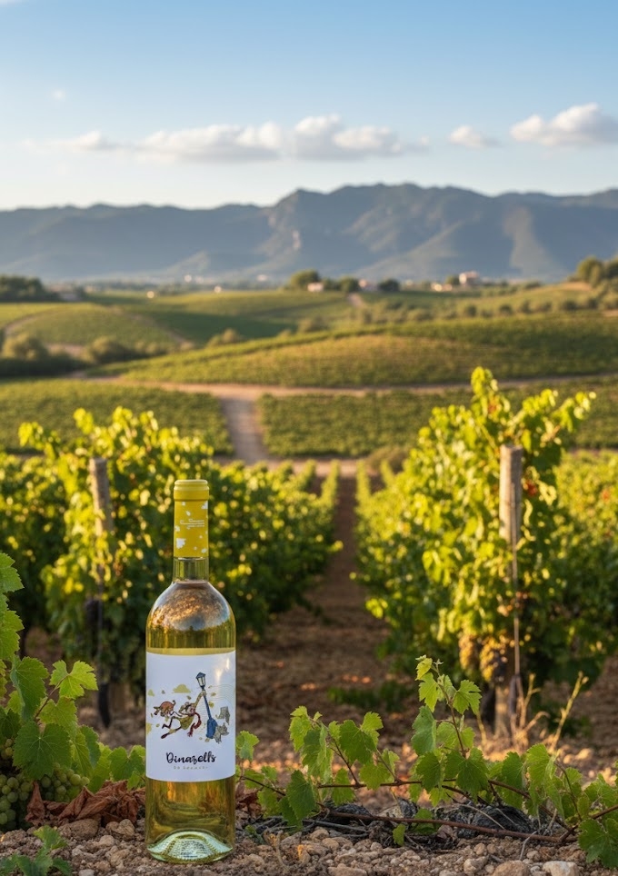 Vi Blanc Dinarells Garriguella, amb les varietats típiques de les nostres contrades, Macabeu, Garnatxa blanca i Moscatell d’alexandria. Blanc lleuger i afruitat