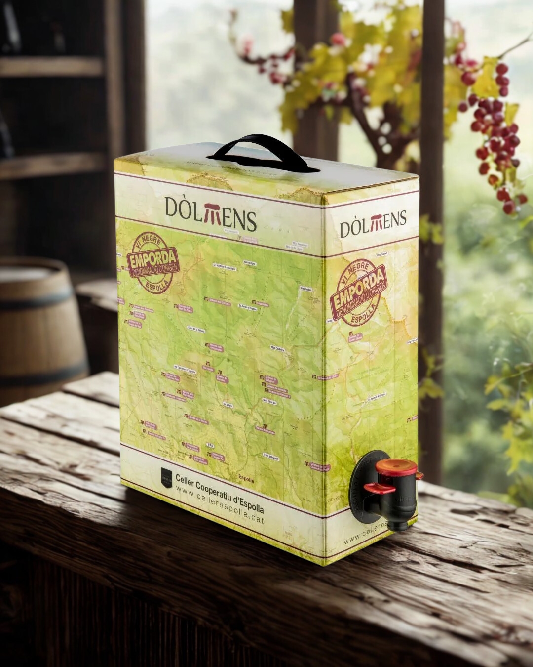 El Dòlmens Bag-in-Box és un vi negre jove produït per Celler Espolla a l’Empordà. Vi negre elaborat amb una maceració de durada mitjana per aconseguir un bon equilibri entre color, aromes i estructura. La fermentació es realitza en dipòsits de ciment, que permeten preservar l’expressió natural de les varietats. Posteriorment, el vi es cria durant tres mesos en contacte amb les seves mares fines i fragments de roure, que aporten complexitat i delicats matisos de fusta.