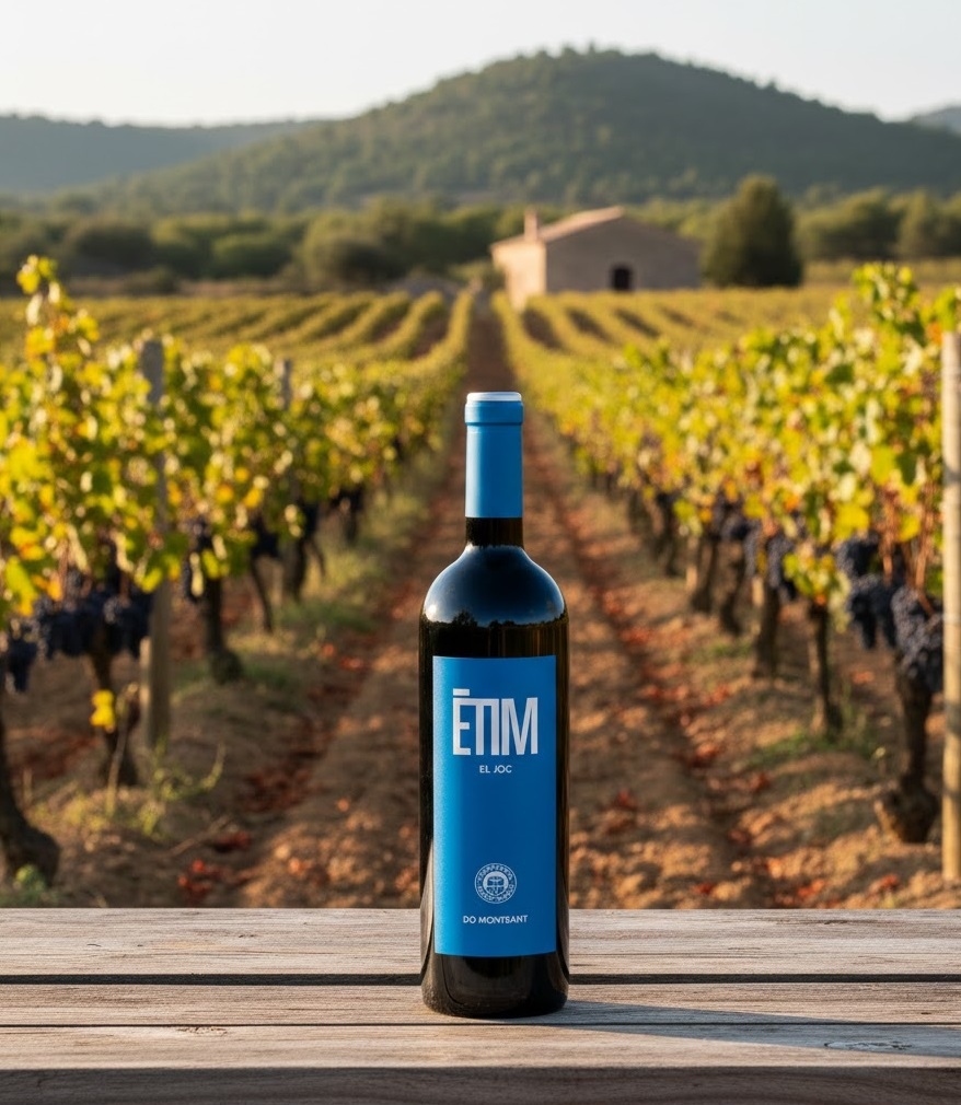 Vi negre Ètim El Joc Falset Marçà, elaborat amb Garnatxa, Carinyena, Cabernet Sauvignon i Merlot, vi jove i fresc.